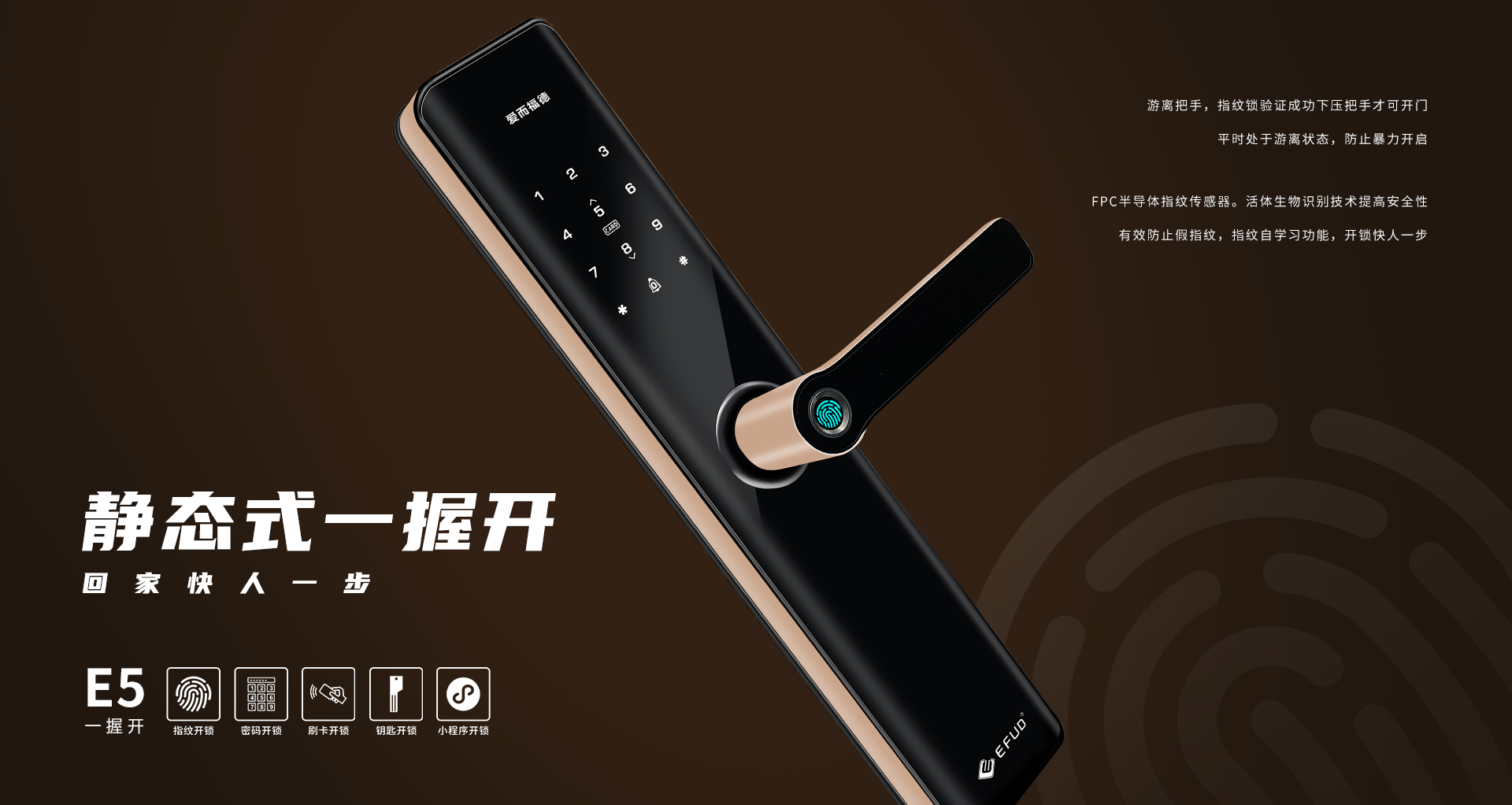 “愛而福德”是一個“為愛而生”的品牌,創始人陳董始終不忘初心,帶著“愛與責任”前行,心無旁騖,只做一件事——專心為家人做一把真正安全與便捷的智能鎖,做一行愛一行,無論面對代理商、經銷商、還是企業員工都要有愛心。愛而福德, 傳播孝道,播種大愛, 讓科技貼近生活,用智慧為您看家!